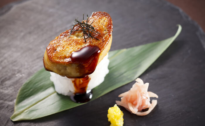 穴子を煮詰めたソースとフォアグラのソテーを合わせた「フォアグラ寿司」。一口で味わう口福の美味しさ。