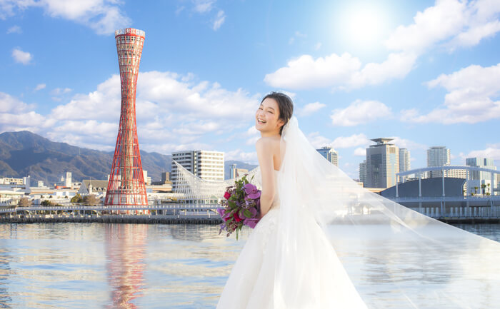 歴史的景観や街路樹など、異国情緒を感じる街並みで有名な神戸を代表する観光スポット「旧居留地」にあり、神戸港を一望する絶景ロケーションが魅力。この特別な景色の中でのフォトシューティングが叶う。