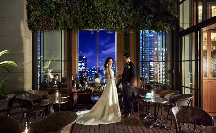 【ザ テラスルーム】会場とテラスを自由に行き来できる自由なパーティは、歓談や写真撮影など、ゲストと楽しい時間を過ごせる。