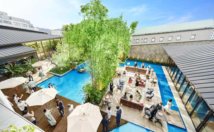 光・水・緑を感じながら過ごせるオープンエアのウォーターテラス。開放的な雰囲気に自然とゲストも笑顔に。
