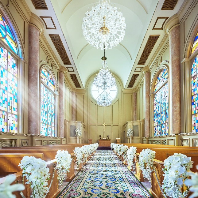 【関西最大級チャペルなど選べる挙式】自然光が降り注ぐ大聖堂にステンドグラスやシャンデリアが美しく際立つ人気の「ザ・クリスタルチャペル」。神前式や人前式のご相談もOK【成約特典挙式料最大半額】