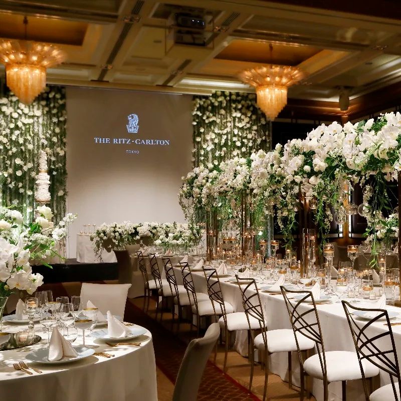 上質で格調高い空間に煌めくシャンデリアが印象的なザ・リッツ・カールトン グランドボールルーム。新郎新婦おふたりの想いが形になった直前コーディネートをご内覧いただけます。