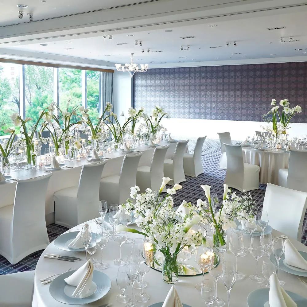 上質で格調高い空間に季節の花々の彩りが加わった披露宴会場のトータルコーディネートをご内覧いただけます。※パークビュールーム(30~80名様)の会場コーディネート内覧可