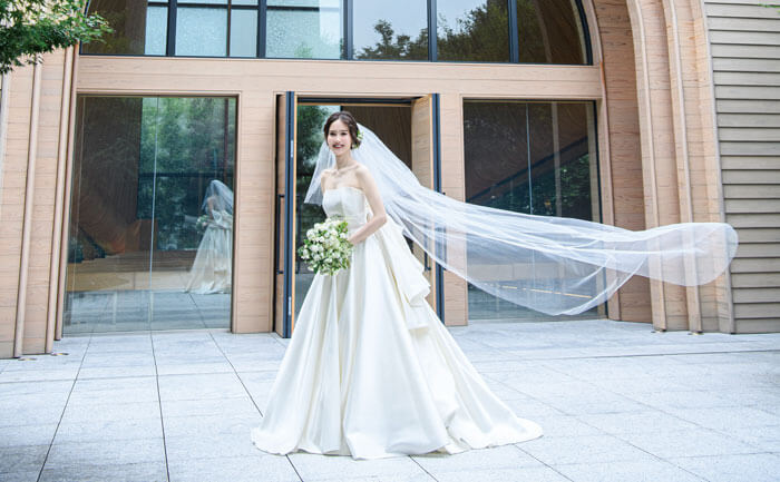 四季折々に表情を変える自然に囲まれたセレモニーが実現。ウエディングドレスも素敵に映える。