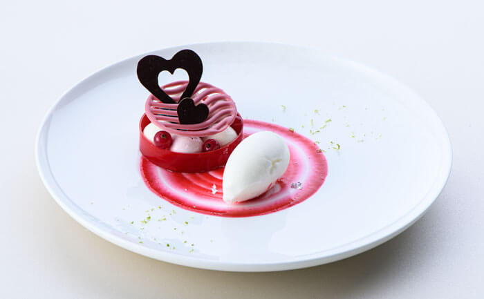 祝宴の最後を盛り上げる華やかなデセール。熱々のソースで溶かすドームショコラは動画映えも。