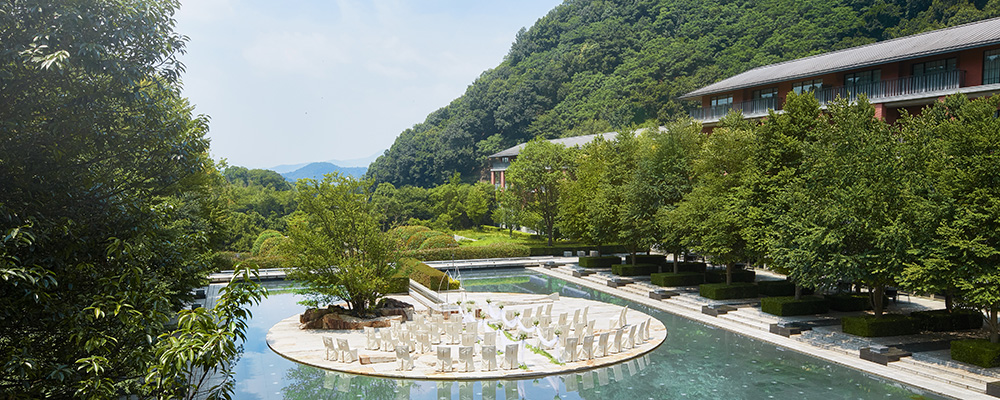 比叡山の山麓に広がる八瀬にある会員制リゾートホテル「エクシブ京都 八瀬離宮」。近くには高野川が流れ、四季折々に表情を変える美しい山々に抱かれるように建ち、非日常的な静かでゆったりとした時間が流れている。通常は会員しか利用できない特別な空間が、ウエディングでは一日一組限定で、誰でも使用できる。山の緑に包まれた山紫水明の地で、贅沢なリゾートウエディングが叶う。この美しい景観を利用した庭園挙式は特に人気。挙式を映画のワンシーンのようにドローン撮影する演出も好評。贅を尽くされた空間では、産地直送の素材を生かした京都らしい料理を味わえ、本物を知るセレブリティたちに支持されている。