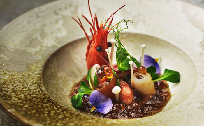総料理長、丸山修司氏が手掛ける新メニュー「フランス会席」。芸術的な料理がふたりの祝宴を華やかに演出。