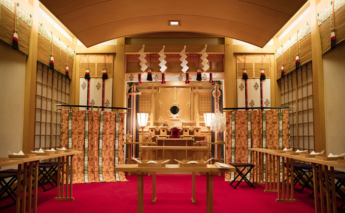 伊勢山皇大神宮をご祭神に祀る館内神殿も完備。近隣神社での挙式も完全サポートしてくれるので安心。