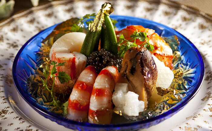 総料理長の丸山シェフを筆頭に、料理界を代表する有名シェフたちが、ふたりの感謝の想いを料理で表現。常にトレンドを意識しながら、普遍的な美味しさにこだわり続けているのは、美食ホテルならでは。