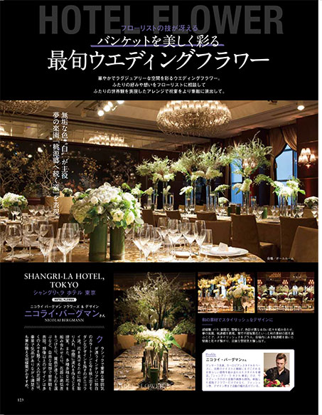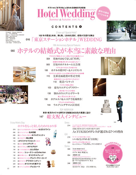 ・【巻頭特集】ホテルの結婚式が本当に素敵な理由 ・100年の歴史と未来、静と動、ときめきと寛ぎ、感動が交差する舞台 「東京ステーションホテル」WEDDING ・「アンダーズ 東京」で叶うふたりだけのウエディング ・和と洋も最上級の美を際立てる「グランド ハイアット 東京」WEDDING ・「ザ・リッツ・カールトン東京」The Genuine Weddingの約束 ・今もこれからも、ふたりとともに「パレスホテル東京」 ・東京・横浜のホテルを牽引する敏腕GMの素顔に迫る!総支配人インタビュー , etc.
