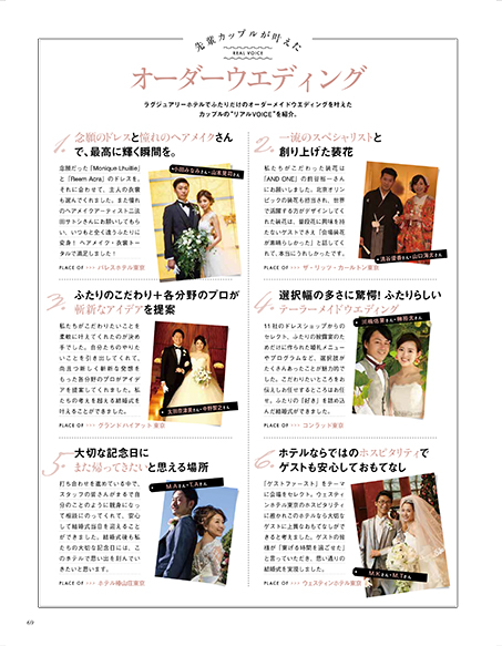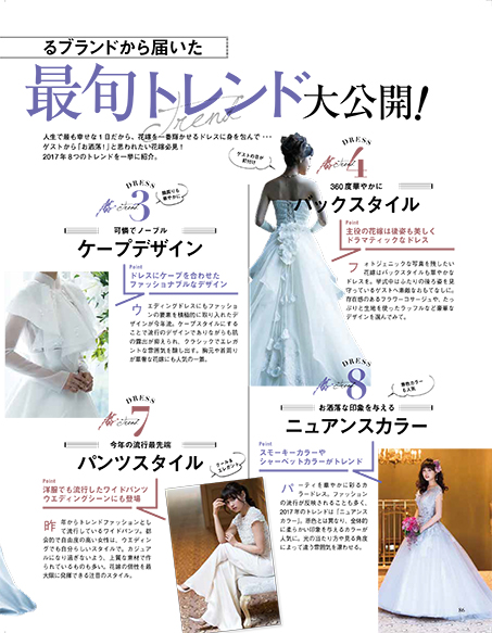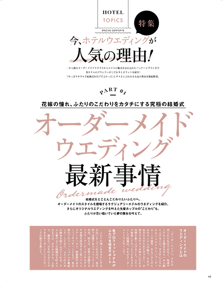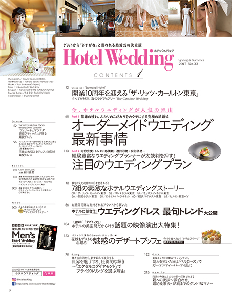 ・開業10周年を迎える「ザ・リッツ・カールトン東京」 ・オーダーメイドウエディング最新事情 ・注目のウエディングプラン ・7組の素敵なホテルウエディングストーリー ・ウエディングドレス 最旬トレンド大公開! ・魅惑のデザートブッフェ , etc.