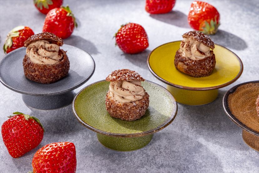 シュー生地とシューサブレ生地はコロンビア産カカオ100%のカカオパウダーで仕上げ、チョコレート生クリームにはティエラを贅沢に。お好みでフレッシュな美濃娘と合わせて味変を。