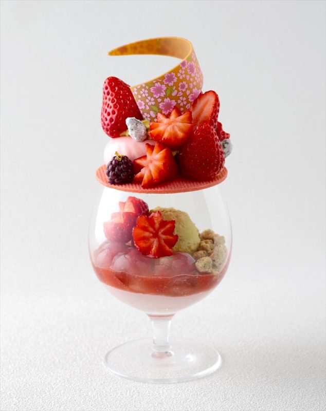グラスの中には、爽やかなシトロンジュレに包まれた桜の花びらが春の訪れを感じさせ、まろやかなピスタチオアイスやサクサクとした食感が楽しい桜香るクランブル、いちごミルクのパンナコッタなどが層をなし、最後まで飽きることなく楽しめます。