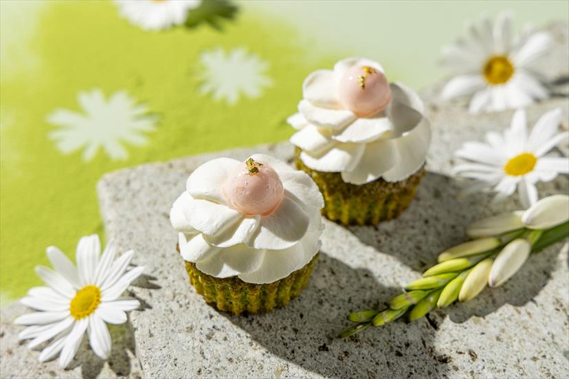 ▲抹茶のカップケーキ ベルガモットとルバーブジャム