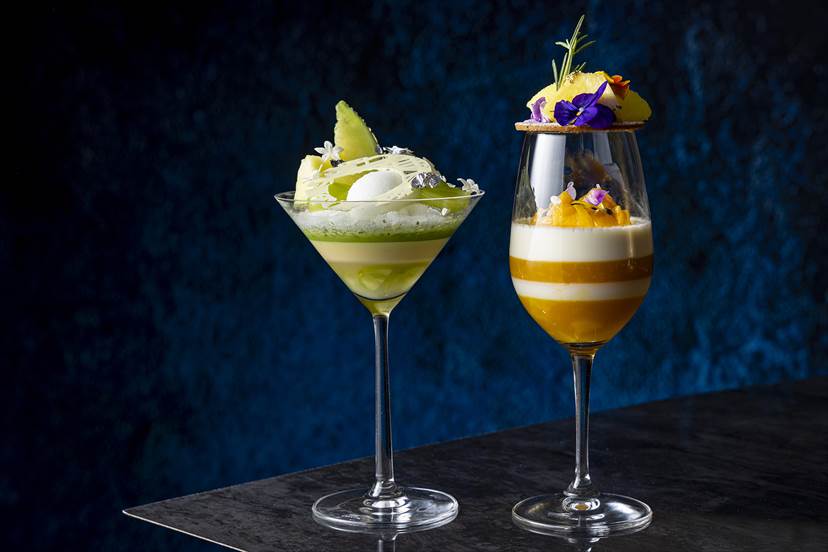 マンゴーやパイナップルにココナッツを重ねた「ピニャコラーダ」は、ひと匙ごとに南国のビーチリゾートの情景がうかぶようなトロピカルな味わいのパフェ。鮮やかなオレンジ色のマンゴーゼリーやパイナップル、パッションフルーツなどを合わせたエキゾチックゼリーにココナッツパンナコッタとマスカルポーネココナッツムースがなめらかに調和し、まるで上質なカクテルを味わっているよう。