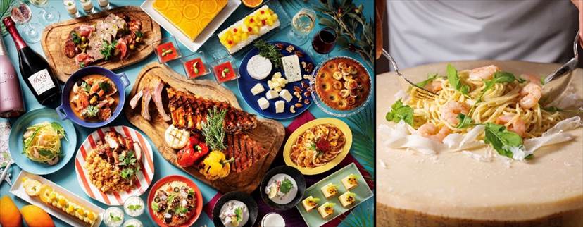ヨーロッパからアジア、南米まで、世界15か国以上の料理が全30種とバラエティ豊富なラインアップ。目の前でできたてをご提供するスタンドクッキングでは、じっくりと火入れした肉の旨み溢れる「国産牛ローストビーフ 西洋わさび添え」が期間限定で登場。丸ごとのチーズの上で仕上げる「ホールチーズで仕上げるアンタルヤ風エビとルッコラのリングイネ」は、ダイナミックな演出とともに、地中海の味わいを満喫できる。