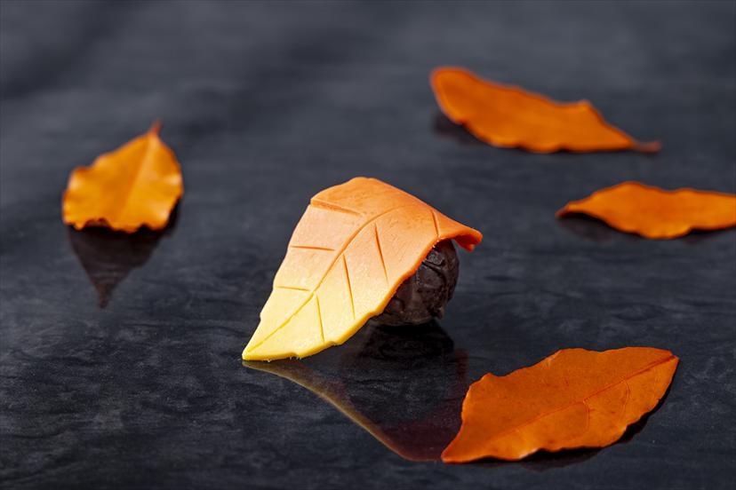 落ち葉に見立てたチョコで包んだトリュフフレーバーのボンボンショコラ。