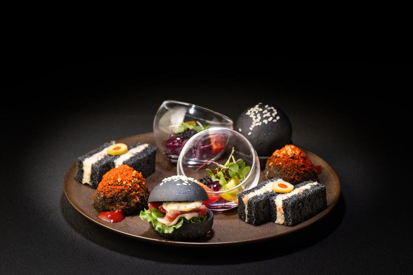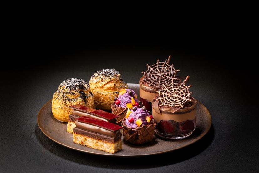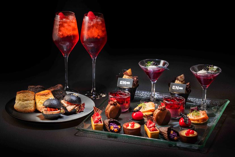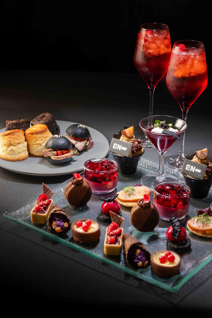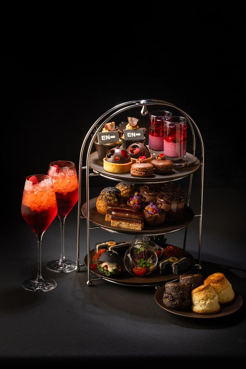 ENHYPENの“ヴァンパイア”コンセプトをファッショナブルに表現した「EN-CHANTED BITE」ENHYPENウィークデイアフタヌーンティー。1日30食限定でご提供するガラスプレートには、色鮮やかで繊細なスイーツとこだわりのセイボリーをバランスよく並べた。