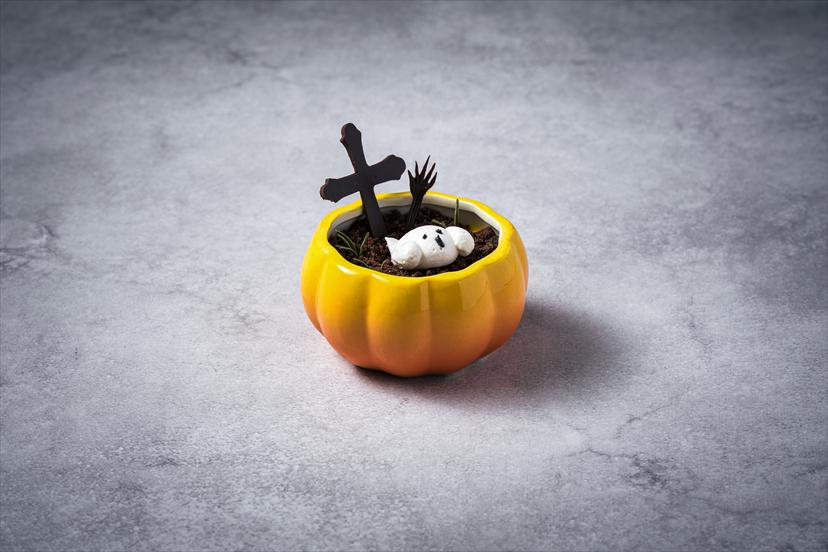ザクザク食感のクッキーで墓地をイメージしたユニークなプリン。濃厚でなめらかなかぼちゃプリンの中には、かぼちゃペーストと一口サイズの焼きかぼちゃがたっぷりと。一緒に食べることで様々な食感を楽しめる。