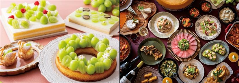 ▲左:シャインマスカット好き必見のスイーツ(ランチ)、右:フリードリンクと楽しむヨーロッパグルメ(ディナー)