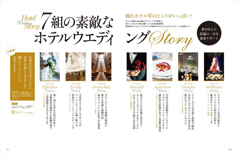 その他、先輩カップルたちの「結婚式までの道のり」や「7組の素敵なホテルウエディングストーリー」、「憧れウエディングブーケ」「ホテルスイーツ&グルメ」特集など、ホテル婚の魅力を深掘りした多彩なコンテンツが盛りだくさんです。