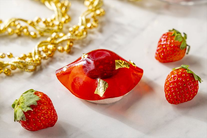 いちご形の可愛いムースの中に、オレンジフラワーを閉じ込めました。苺のヘタをクローバーの形に見立て、幸運を感じさせる遊び心をプラス。
