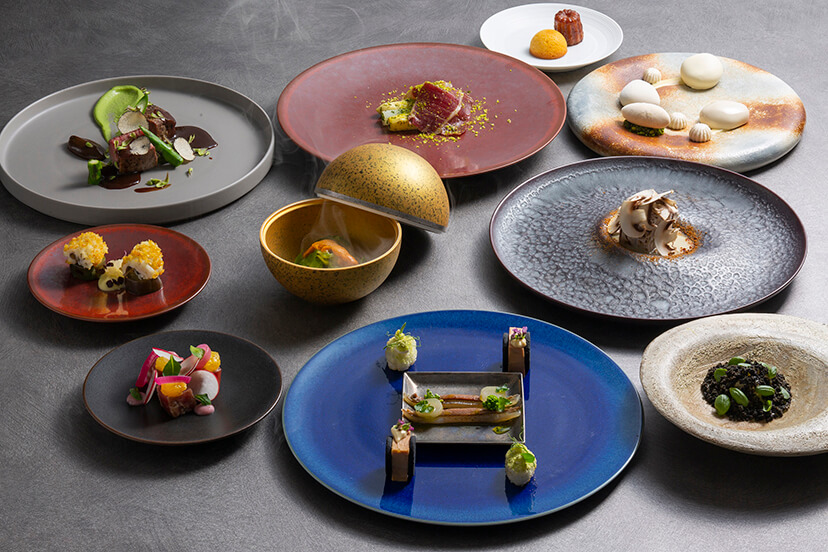 「美味しい物を少しずつ、 たくさんの種類を召し上がっていただけるコース。 一つ一つに遊び心を込めて創り上げました。 あっと驚く組み合わせや、 シンプルな中にも工夫を凝らしたアートのような料理をお楽しみください。 」と料理長 山田は語ります。