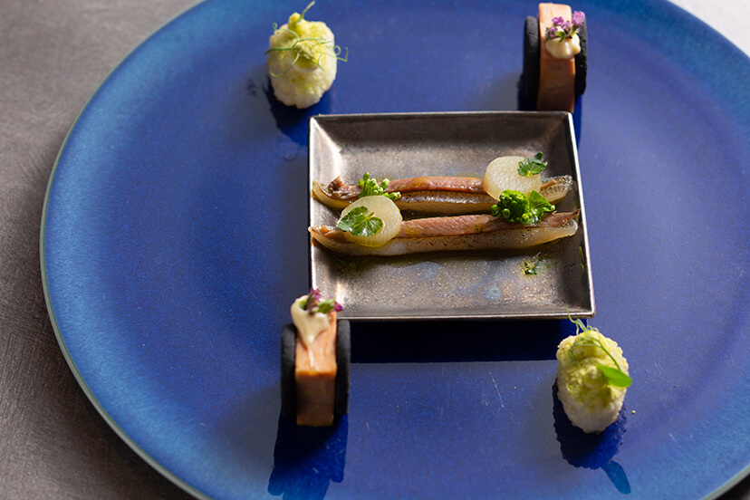調理法や食材の使用方にもこだわり、 「近海産太刀魚/淡路玉葱/六甲シャンピニオン」は、 太刀魚を炙った後ゆっくりと36度のお湯で20分火入れし、 薪で焼いてさらににソテーしています。 また、 野菜は皮も使用する、 バターは使わない、 玉葱は丸ごと蒸し焼きにしてからピューレして甘味を出す、 パスタは卵白だけで練り上げるなど、 山田の料理へのこだわりをシェフや一流のサービスマンと話しながら楽しむことができるのも魅力の一つ。