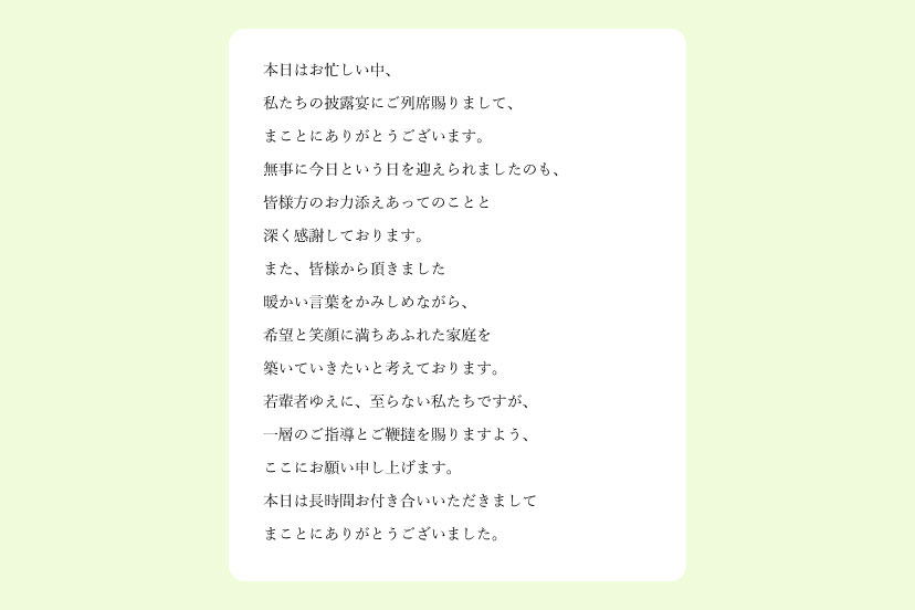 | 結 | ハネムーンの行き先や新居の案内、これからのつきあいへのお願い、結びの挨拶。 |