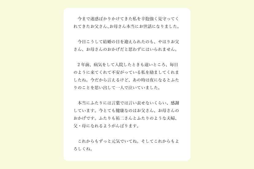 | 結びの言葉 | 今日まで育ててもらったことへの感謝の気持ちやこれからお世話になる新郎の親へ挨拶の言葉で締めましょう。 |