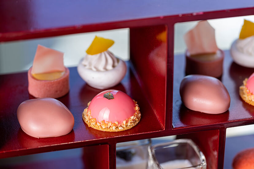 セレブレーションムード溢れる新元号を迎えての初めての夏。 新作アフタヌーンティーは新元号にちなんで「ロイヤルピンク・セレブレーション」をテーマに、 スイーツビュッフェとは異なるラインナップでお送りいたします。 旬のピーチを使用した遊び心あふれる洗練されたスイーツ6種類と、 セイボリーアイテム4種類、 全10種類のメニューを、 コンラッド・アフタヌーンティーのアイコニックな赤い漆を施した和箪笥がモチーフのティースタンドに入れてご提供いたします。