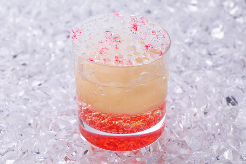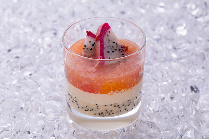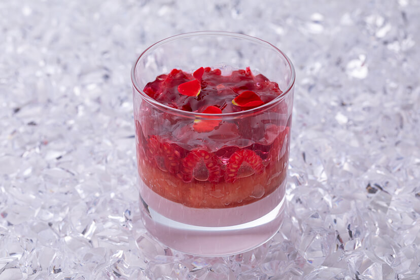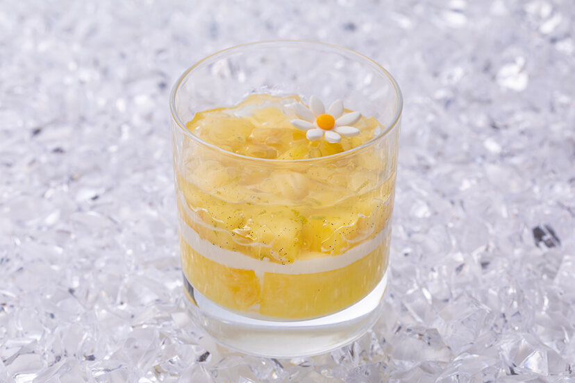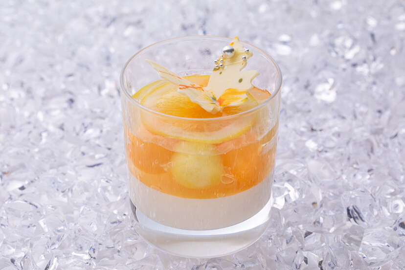 フレッシュピーチに杏仁ムースを合わせ、 ピーチのジュレをのせた旬のピーチを存分に堪能いただけるベリーヌです。 グラスから見える美しい配置にも注目です。