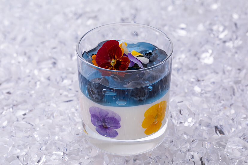 ラベンダーの香りのパンナコッタに青の花茶とも呼ばれる「 バタフライピー 」で色付けをしたジュレにブルーベリーを合わせました。 バタフライピー はブルーベリーの約4倍のアントシアニンが含まれており、 目の疲れを癒す効能や抗酸化作用が期待されると言われており、 健康面からも美容面からも注目されています。 一口食べると鼻に広がるラベンダーの香りがエレガント。 エディブルフラワーを美しくあしらった鮮やかなベリーヌです。