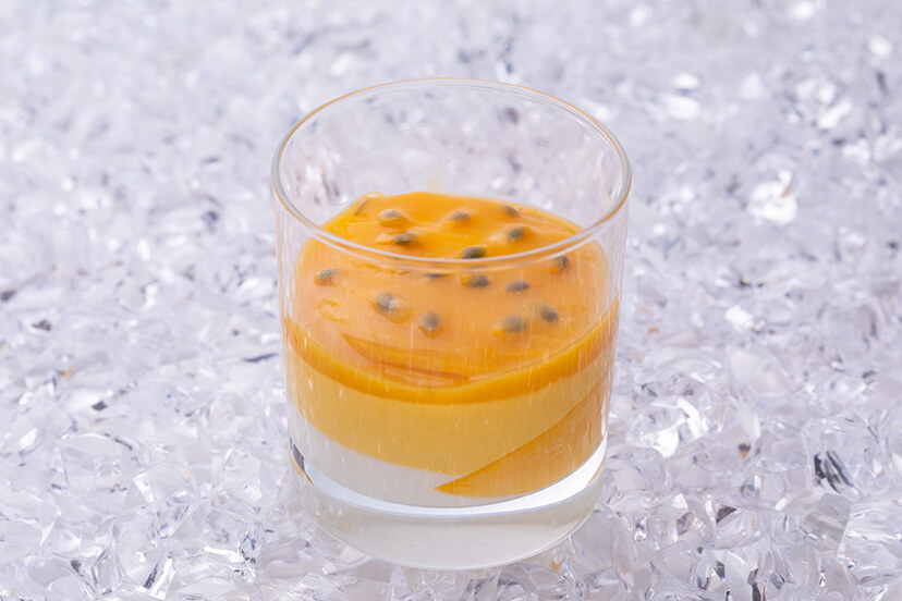 ココナッツのブランマンジェにフィオレンティーナで人気のマンゴープリンとフレッシュマンゴーをのせた、 南国の雰囲気をお楽しみいただけるベリーヌ。 1番上にのせたパッションフルーツのソースと種がアクセントに。
