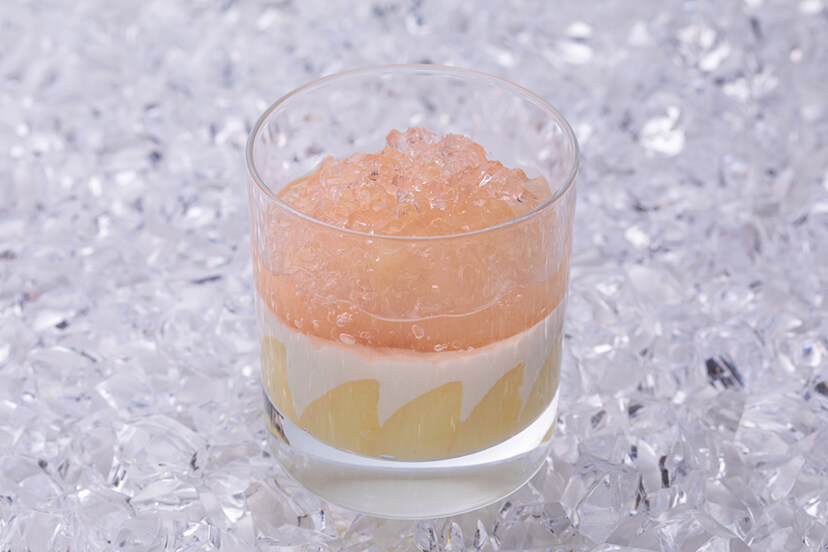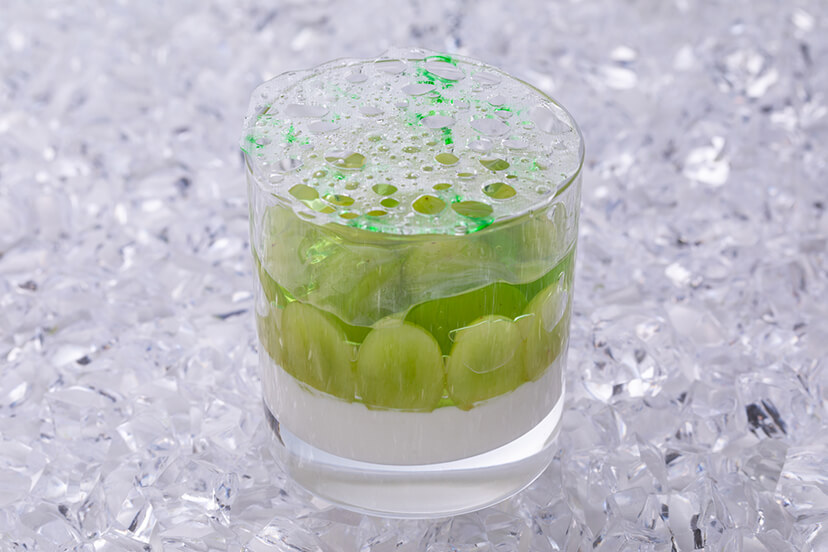 ブランマンジェとシャインマスカットの上にアイスワインのジュレをのせています。 ブランマンジェの香りがシャインマスカットの甘みとマッチする大人の味わい。 上にのせた美しい飴細工とともにお召し上がりください。