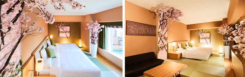 「桜スイートでお花見プラン」は、ナチュラルコンフォートフロアの和室スイートを1日1室限定で桜のアートフラワーを用いて装飾。また、特典として気品のある優しい味わいで女性にも人気のスパークリング清酒「すず音」や、「鶴屋八幡」の和菓子をおひとり様につき1つずつご用意。天井まで届く桜の木やウォールアートなどを存分に楽しみながら、ご家族やご友人とプライベートな空間でお花見をお楽しみいただけます。