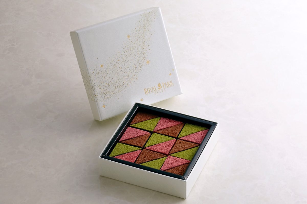 フランスのヴァローナ社のチョコレートを使用し、何度も試作を重ねて口どけの良さを追求、とろけるような滑らかさに仕上げました。中にはフィアンテーヌ(焼き上げた生地をフレーク状にしたもの)を仕込み、さくさくとした食感もお楽しみいただけます。ブラックチョコレートに加え、華やかな香りが広がる抹茶とストロベリーの3種をご用意、三角形のモザイク模様で遊び心を演出した高級感あふれる生チョコレートです。商品名とパッケージデザインは、当ホテルの女性商品開発チーム「ミルキーウェイ」が担当。“生チョコレートをお召し上がりになって、ほっと一息つける「瞬間」をお届けしたい”という想いを込めて、「THE MOMENT」としました。また、パッケージは当ホテルのロビーに輝く天の川をモチーフにしたシャンデリアをデザインに採り入れました。当ホテルが自信を持ってお届けする、新しいシグネチャー商品の「THE MOMENT」を、感謝を伝えるギフトやお手土産、ご自分へのご褒美として、ぜひお楽しみください。
