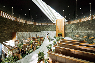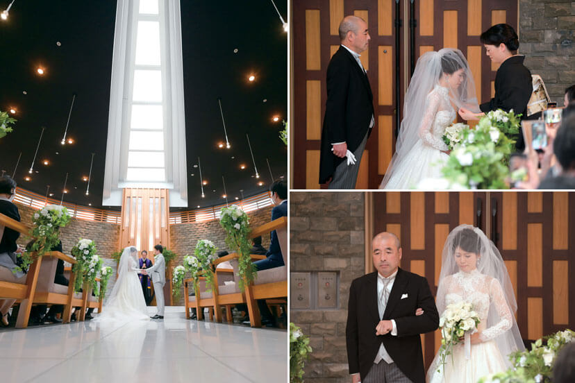 天井から柔らかな自然光が入るガーデンチャペルでの挙式。母によるベールダウンの後、父と歩くバージンロードはどこかぎこちなく、お互いの緊張を感じる時間に。新郎に交代してから離れていく父の姿に、寂しさと、結婚をしたという実感が溢れてきたそう
