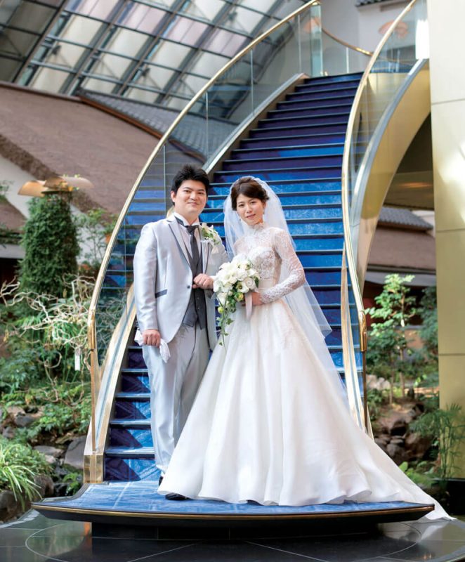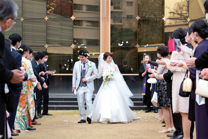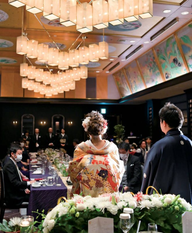 芸術的で特別感のある施設に加え、ホスピタリティの高さから「ホテル雅叙園東京」に決めたふたり。1年以上前から準備を進めていたもののコロナの影響で延期することになった。中止するべきか悩んだが、招待予定のゲストからの温かいメッセージに後押しされて開催することに。結婚式当日は、ゲストが不安にならないように、受付には新婦セレクトのマスクケースやアルコールジェルなどの感染予防グッズをセットで準備し、手作りの説明書も同封して全員に渡した。挙式では、表情が見えるよう透明マスクも配布。そんなふたりの気遣いに、ゲストからは感謝の言葉と共に「幸せな気持ちになった」「感動して涙が出た」という感想も聞くことができた。「開催時期が変わったこともあって、衣裳の選び直しや、レイアウトや装飾の変更、感染予防を意識した進行づくりなど、悩みが尽きない日々でした。その中でたくさんの人たちに支えられていると実感できたことが一番の思い出。結婚式をしてよかったです!」と語ってくれた。