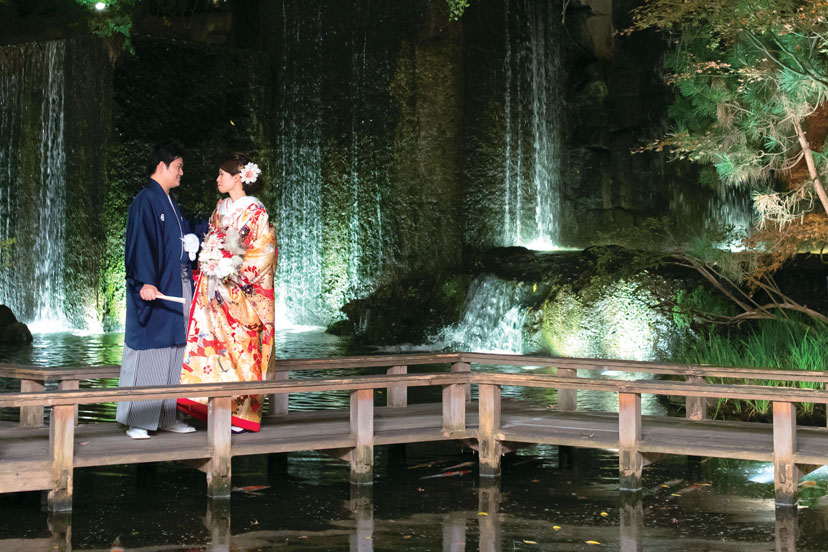 紅葉が美しい滝の前で、色打掛での記念撮影シーン。掛下や半襟、小物の色みやデザインにもこだわりモダンに仕上げた