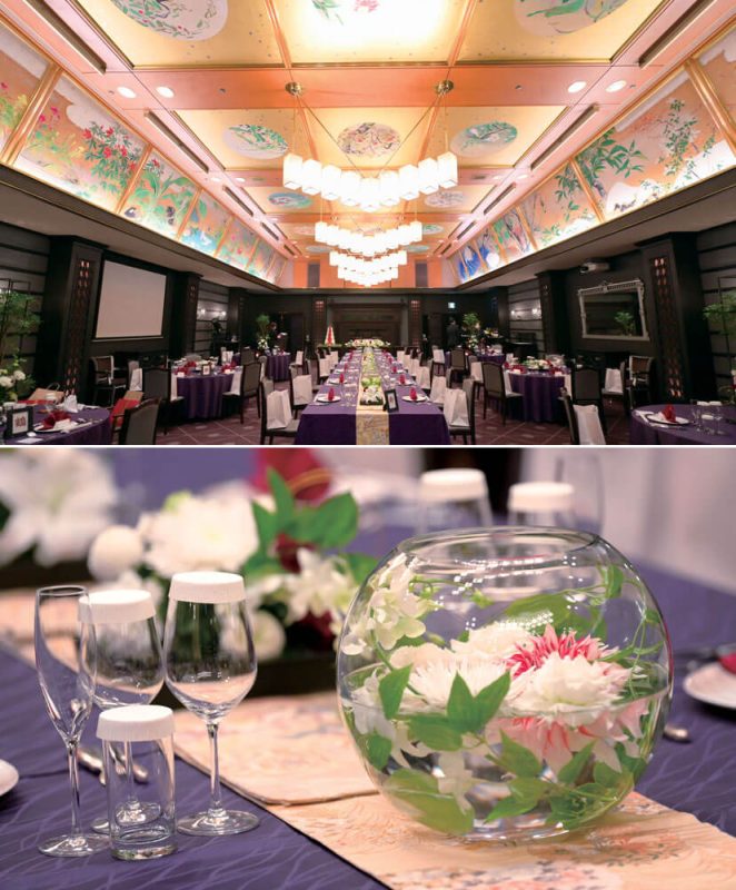 会場には長テーブルと円卓を配置、帯の上に水に浮かぶ花や黒皿を置き、テーブルごとの花器に高低差をつけ、白の花をメインに華やかに全体をまとめた