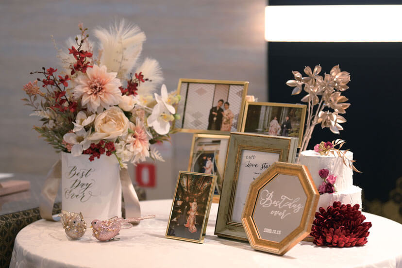 ウエルカムスペースには和装での前撮り写真をモダンに飾った