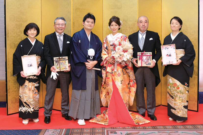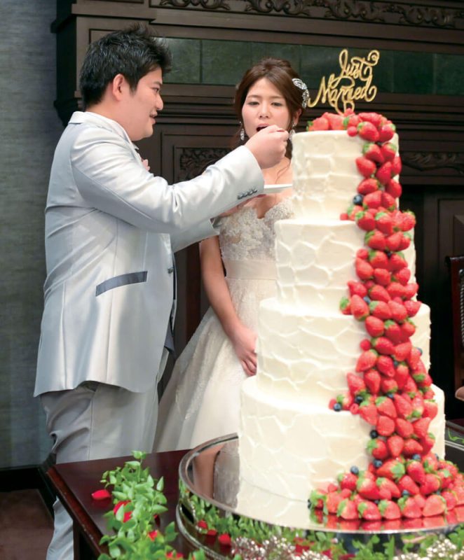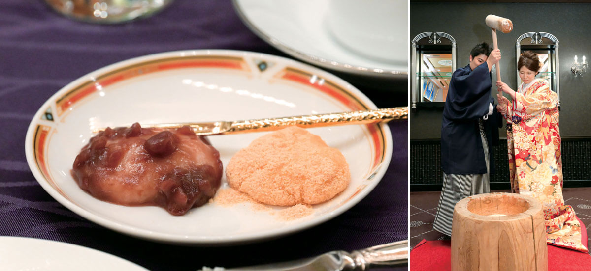 「祝い餅」というプロによる餅つきパフォーマンスのあと、新郎新婦、ゲストペア3組の順番でお餅つき。会場に一体感が生まれた。通常はそのお餅をデザートで振る舞う演出なのだが、感染予防のため差し替えての提供となった