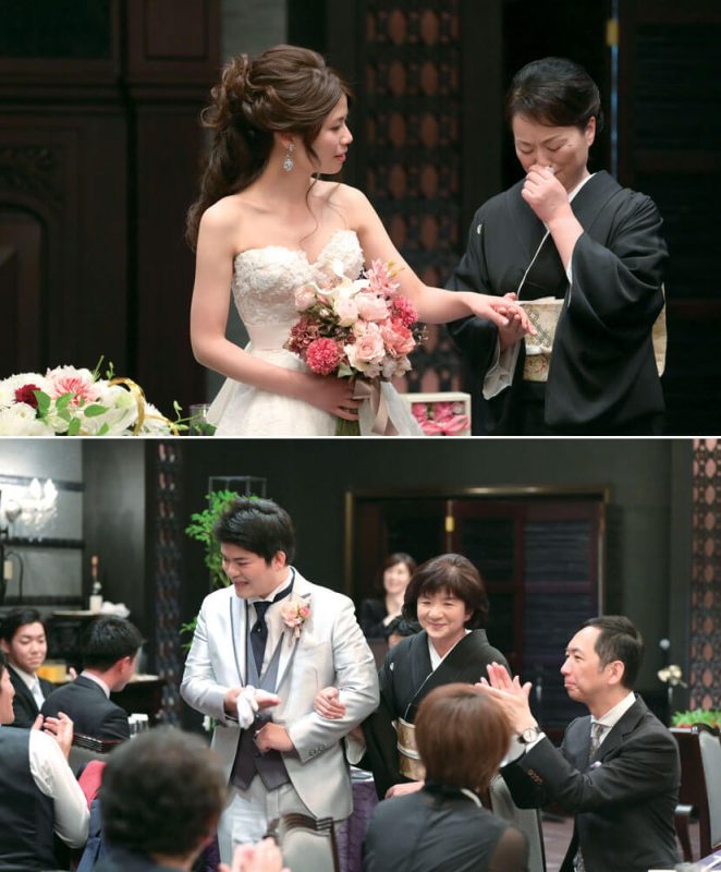 結びのシーンでは両親へ「子育て感謝状」をプレゼント。生まれてから結婚式までの日数と、子供の頃と前撮り写真を印刷し、感謝の気持ちを綴った