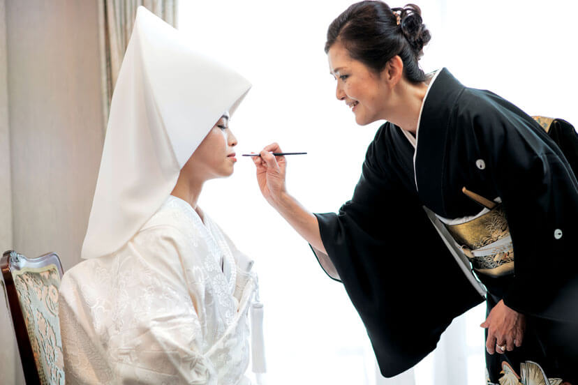 母に紅を差してもらい、花嫁支度が完成。親族や友人が見守るなか、母とふたりだけの時間が流れ特別なひとときとなった
