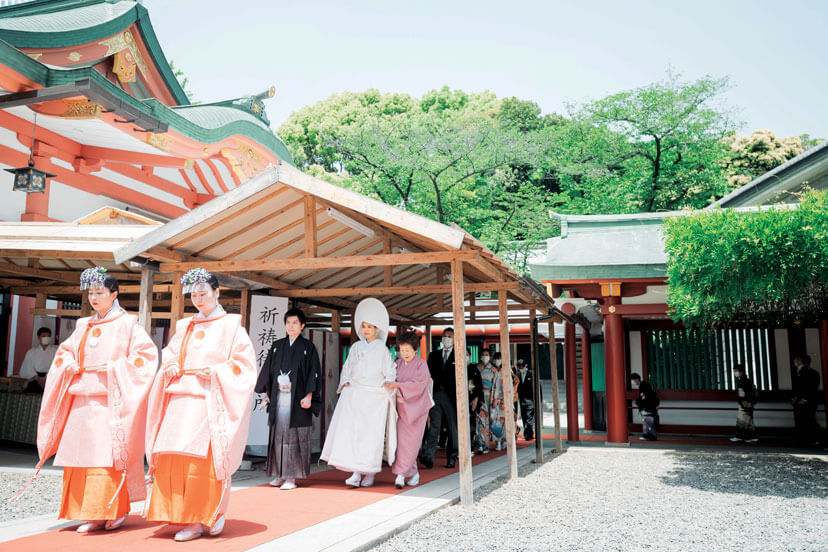 挙式はホテル近隣の「日枝神社」で。厳かな空気に包まれて夫婦の誓いをたてた