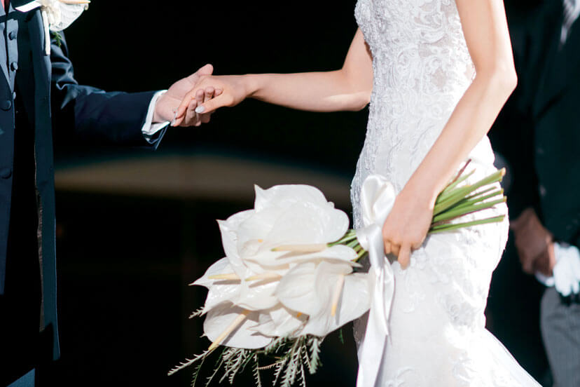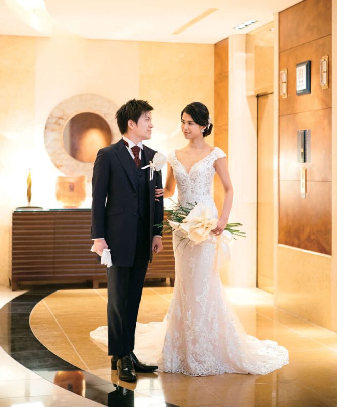 ホテル婚らしさと自分たちらしさ、両方にこだわった結婚式のテーマは「シンプルで洗練されたウエディングに懐かしさを添えて」。濃いグリーンが主役の装花、シックな色使い、アイテム一つひとつにこだわり、スタイリッシュに創り上げた空間でゲストをおもてなし。家族愛や感謝の気持ちを伝えられるような演出にもこだわった。「日枝神社」で執り行った神前式でバージンロードを歩かない代わりに、披露宴は父と共に入場。ふたりのプロフィールを紹介したのは、司会者ではなく両家母。ふたりが知らない母ならではの子育てエピソードも飛び出し「こんな演出の仕方もあるんだ」と誰もが感心した。さらに、新郎から新婦へ100本のバラの花束を贈るサプライズも。大切なシーンや映像演出では、家族や友人にとって馴染みある曲や新婦が昔好きだった曲など、こだわりのBGMが懐かしい気持ちや情緒を揺さぶり、感動の瞬間を大いに盛り上げた。「家族愛を感じた」「私も結婚したくなった」という言葉をたくさんもらい、心温まる理想の一日を叶えることができた。