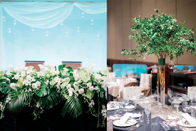 装花はグリーンをベースに、ナチュラルになり過ぎないよう濃い緑の花材をオーダー。キャンドルをたくさん使い、照明を落とした際に幻想的な空間演出を。クロスはダークなカラーでシックにまとめた