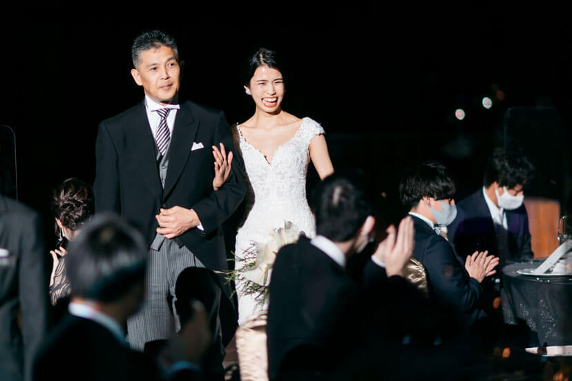 披露宴は父と共に入場。少し緊張しつつも、気持ちを隠すように笑っている姿がいつもの父らしく印象的だった。バージンロードを歩くことにこだわりはなかったが、父との大切な思い出になった
