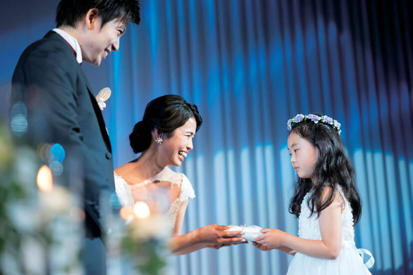 約20年前に、叔母の結婚式でフラワーガールを務めたという新婦。その叔母の娘にあたる小さな従妹がリングガールに。家族の縁が繋がる演出に親族が喜んでくれた